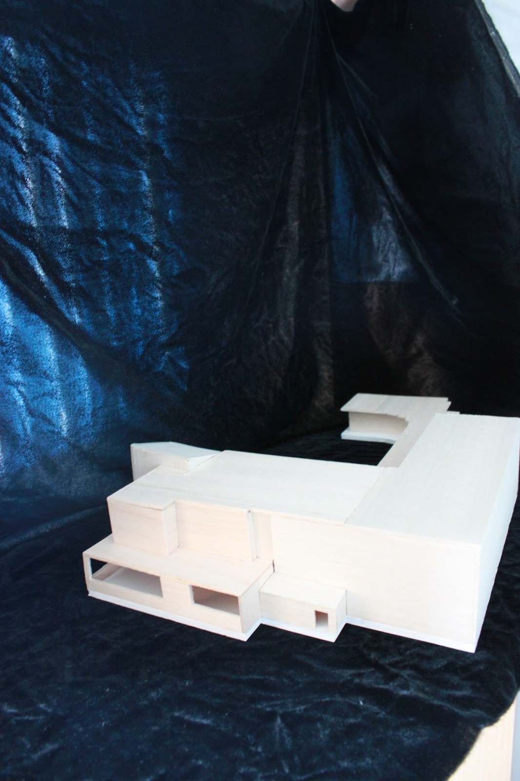 And this 1:100 model of villa mairea shows the relationship between the chosen part in part a and whole building. Because it is relative public area. The opening windows will provide wider vision of people inside, and relative private space including the first floor and another side of building. I used the solid and enclosed walls to represent its privacy.